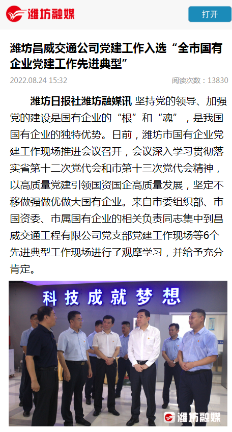 近日,濰坊融媒以《濰坊昌威交通公司黨建工作入選“全市國有企業黨建工作先進典型”》為題報道了集團所屬昌威保安集團子公司昌威交通工程公司黨建企建融合發展的經驗做法,這是繼學習強國平臺、濰坊日報等媒體宣傳報道以來,又一家新聞媒體對公司黨建工作經驗進行宣傳報道。