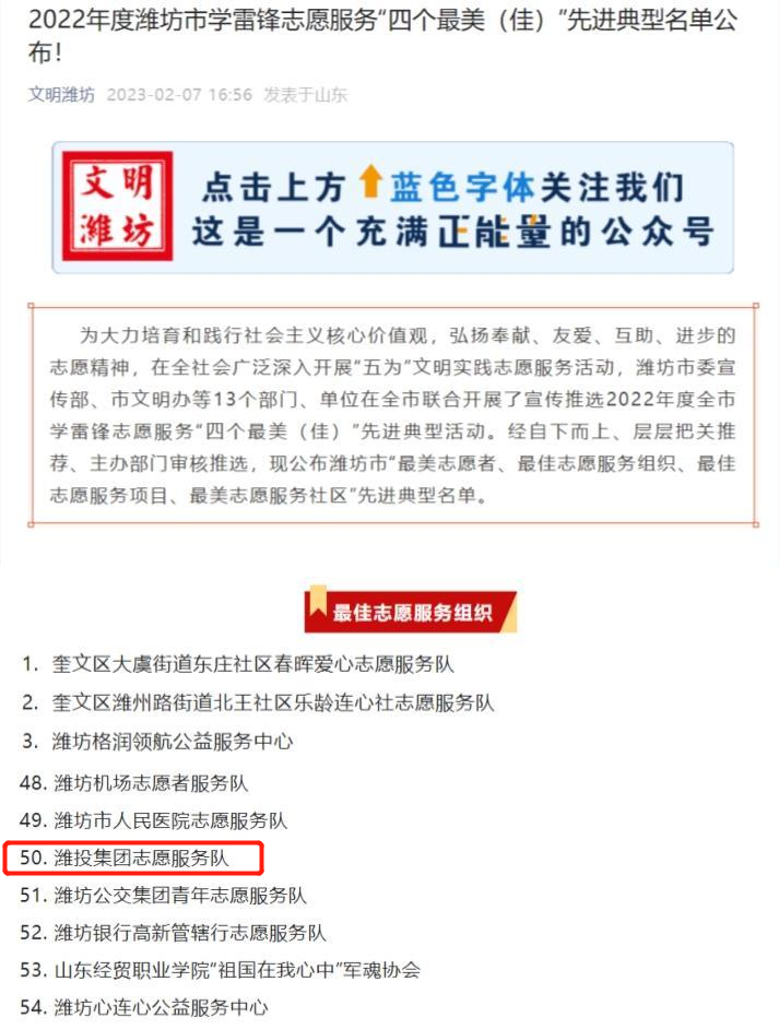 濰坊市委宣傳部、市文明辦等13個部門、單位在全市聯合開展了宣傳推選2022年度全市學雷鋒志愿服務“四個最美(佳)”先進典型活動, 濰投集團志愿服務隊榮獲“最佳志愿服務組織” 。