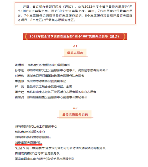 在第60個“學雷鋒紀念日”到來之際,在百草權輿、鶯吟燕儛的春日里,濰投集團志愿服務隊獲省級殊榮!在省委宣傳部、省文明辦等部門通報表彰的2022年度山東省學雷鋒志愿服務先進典型中,集團志愿服務隊獲得“最佳志愿服務組織”稱號,這也是濰坊市屬國有企業中唯一獲此殊榮的志愿服務組織。