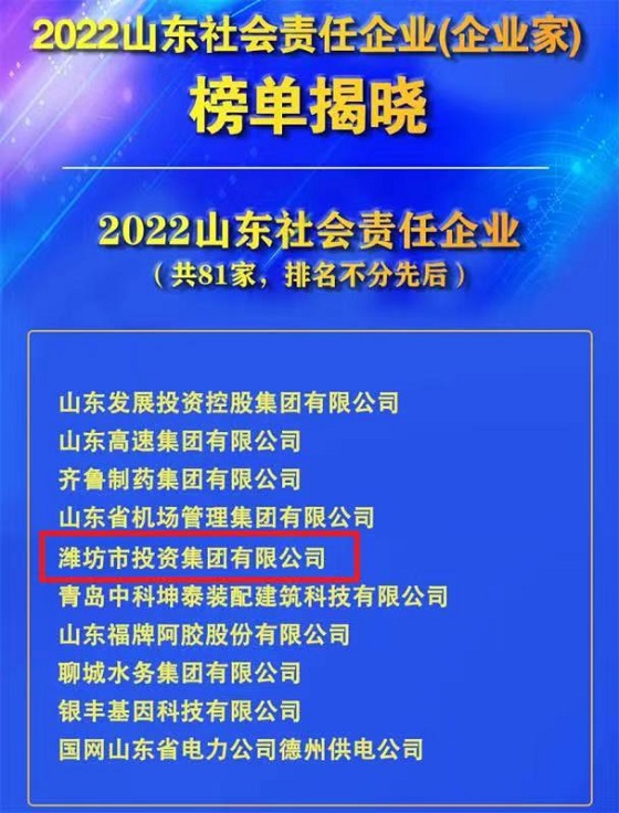 履行社會責任是國企的天職,也是與生俱來的社會屬性。濰坊市投資集團是濰坊首家市屬國有投資企業,經過30多年奮斗,已成為擁有參控股企業100余家、資產規模達757億元的大型投融資集團。在推動自身發展的同時,集團牢記“國之大者”,始終堅持“為政府創造價值,為員工創造機會,為社會創造和諧”發展宗旨,將履行社會責任融入發展全過程和各環節,探索構建履行社會責任常態化、長效化新機制,樹立了“效益優良、社會尊敬、員工自豪”的國企典范。此次獲評“2022山東社會責任企業”,既是對集團各項工作的充分肯定,也體現了社會各界對集團踐行國企擔當、傾情回報社會的高度贊賞。集團必將以此次活動為契機,心懷國之大者,踐行國企責任,堅定不移服務實體經濟,全力以赴穩增長,為濰坊新時代社會主義現代化強市建設作出新的更大貢獻!