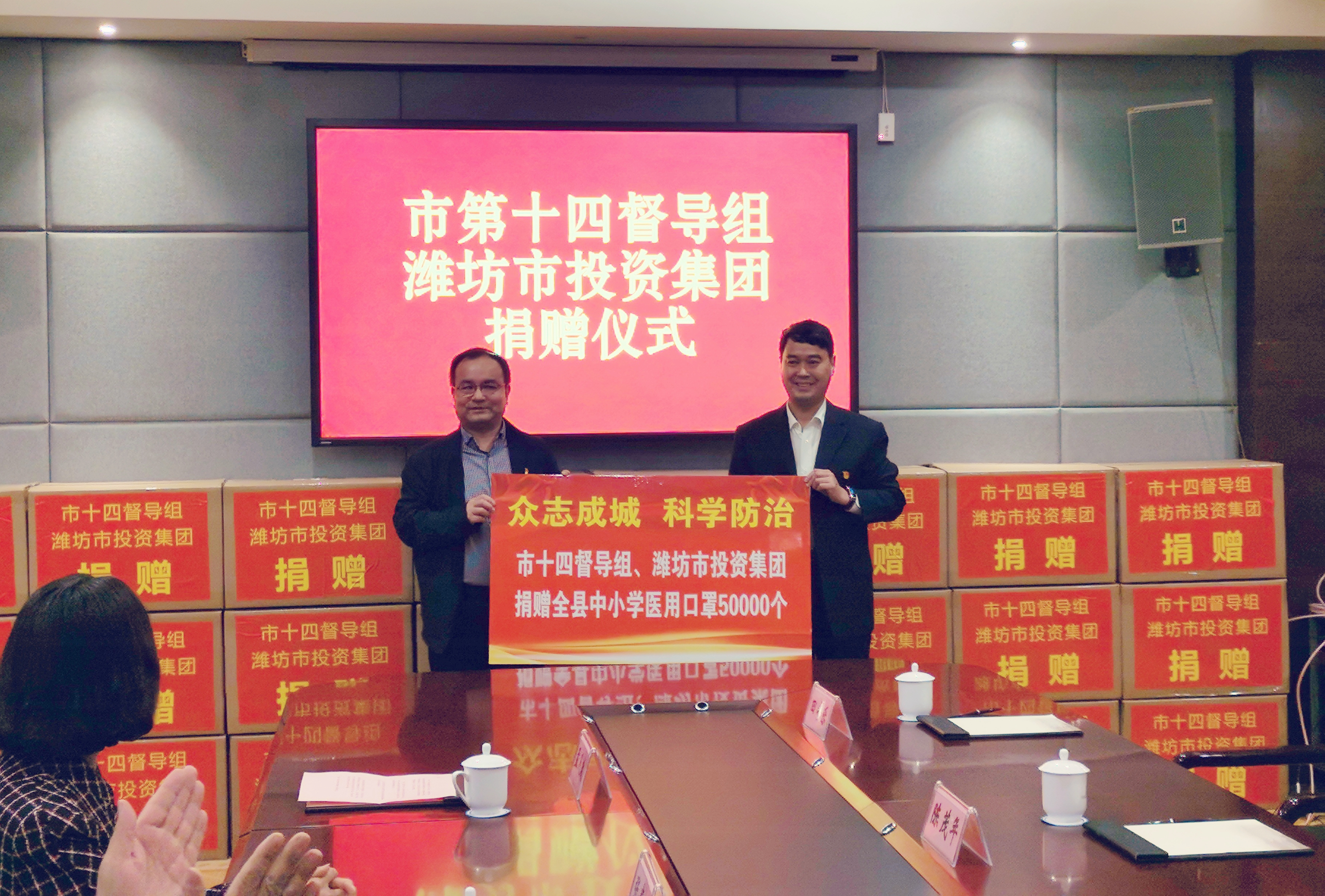 2020年5月9日下午,集團公司黨委副書記陳茂年帶領有關人員前往臨朐縣,代表集團公司向臨朐縣教育體育局捐贈5萬只一次性醫用口罩,助力該縣中小學復學復課。市十四督導組組長、市國資委黨委委員、副主任董軍,臨朐縣副縣長張惠玉及縣教育體育局、紅十字會等單位負責同志出席捐贈儀式。