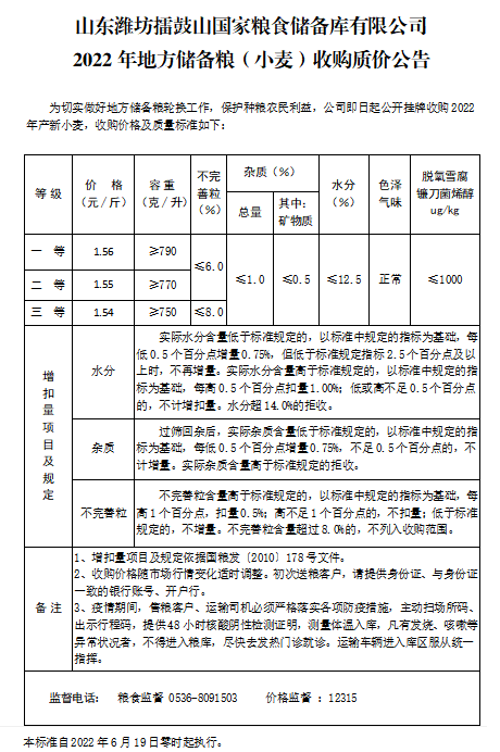 山東濰坊擂鼓山國家糧食儲備庫有限公司屬國有糧食企業,主要職責是承儲市級地方儲備糧及部分成品糧油,代儲中央事權儲備糧任務。為維護種糧戶利益,切實保障糧食安全,經市政府研究決定,指定我企業開展夏糧收購工作。