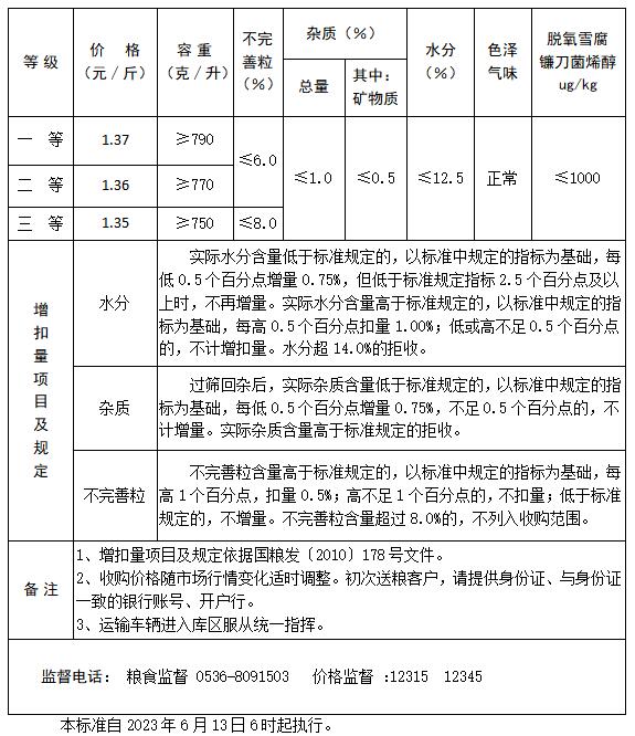 為切實做好地方儲備糧輪換工作,保護種糧農民利益,公司自2023年6月13日6時起至輪換任務完成止公開掛牌收購2023年產新小麥,收購價格及質量標準如下: