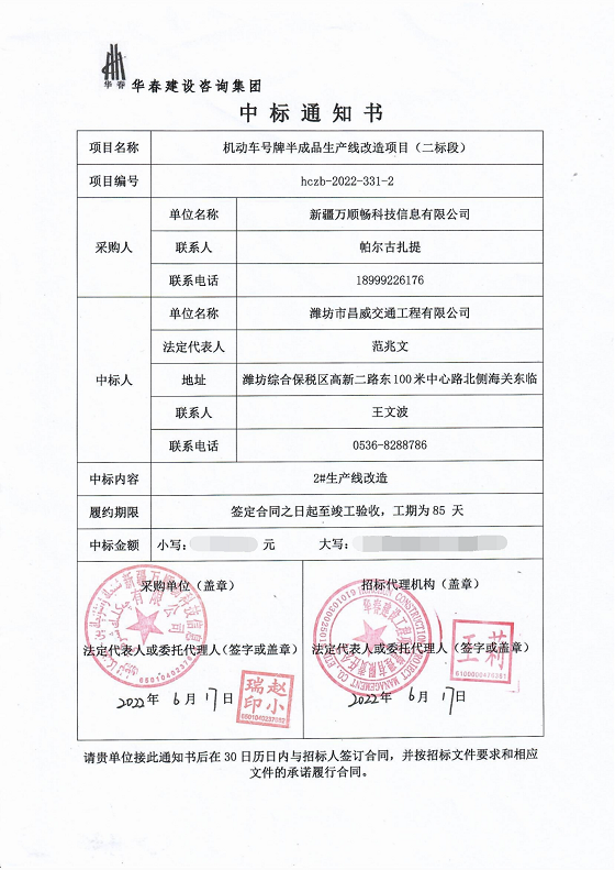 6月22日,集團所屬濰坊市昌威交通工程有限公司成功中標新疆機動車號牌半成品生產線建設項目,是繼廣東、遼寧號牌中心生產線建設項目之后的又一重大項目,標志著交通工程在技術服務輸出道路上又邁進了一大步。