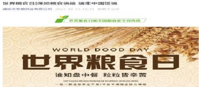 在集市上,黨員志愿者圍繞如何實現科學儲糧、安全用糧、合理膳食、愛糧節糧知識和家中大米應該如何保存、防治小竅門等一系列問答,向社區群眾進行宣傳,并現場發放世界糧食日相關宣傳資料100余份,號召社區廣大群眾加入到愛糧節糧的實際行動中來。與此同時,公司還通過微信公眾號發布世界糧食日和全國糧食安全周宣傳稿件,并要求全體職工利用微信工作群、微信朋友圈廣泛轉發,引導廣大干部職工自覺弘揚“節糧、愛糧、惜糧”的傳統美德,營造濃厚的節糧愛糧氛圍。