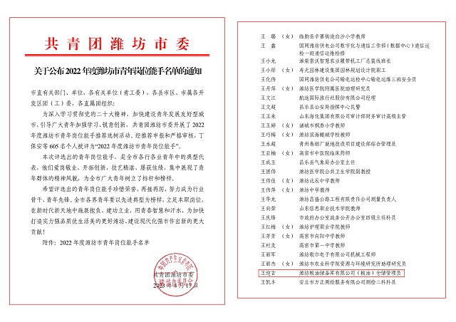 近日,共青團濰坊市委公布了“2022年度濰坊市青年崗位能手”名單,集團所屬糧油儲備庫公司王迎吉榮獲“2022年度濰坊市青年崗位能手”稱號。