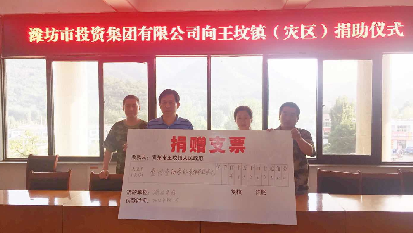 洪水無情,人間有愛。為幫助受災群眾度過難關,盡快恢復群眾正常生產生活秩序,2018年8月29日,集團公司黨委組織開展“情系災區 奉獻愛心”抗災救災愛心捐助專項活動。集團公司領導班子成員帶頭捐款,全體員工紛紛解囊,短短一天時間,共募集捐款113133元,全部捐助于集團公司負責包靠的青州市王墳鎮澇洼村,以拳拳愛心支援抗災救災工作。