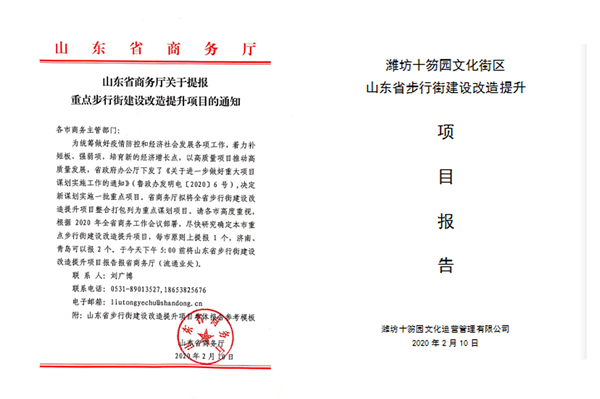 步行街改造提升和繁榮發展夜經濟等工作,是中共中央、國務院《關于完善促進消費體制機制進一步激發居民消費潛力的若干意見》和2018年中央經濟工作會議、2019年《政府工作報告》、國務院辦公廳《關于加快發展流通促進商業消費的意見》以及山東省政府《關于加快推進夜間旅游發展的是會意見》等部署的重要任務。2020年2月10日起,我公司已在山東省商務廳、濰坊市商務局等部門指導下開展了省級步行街創建申報工作。