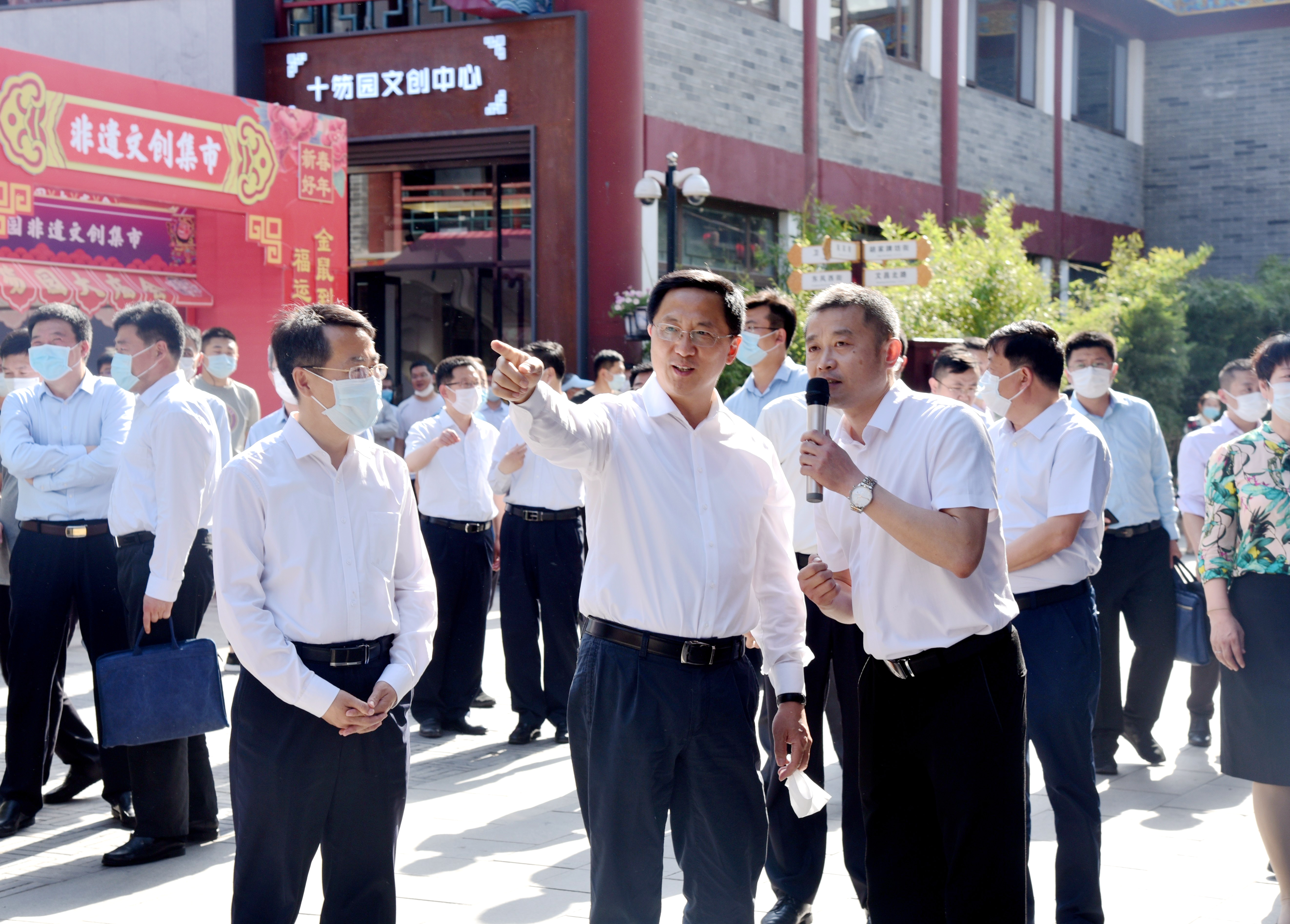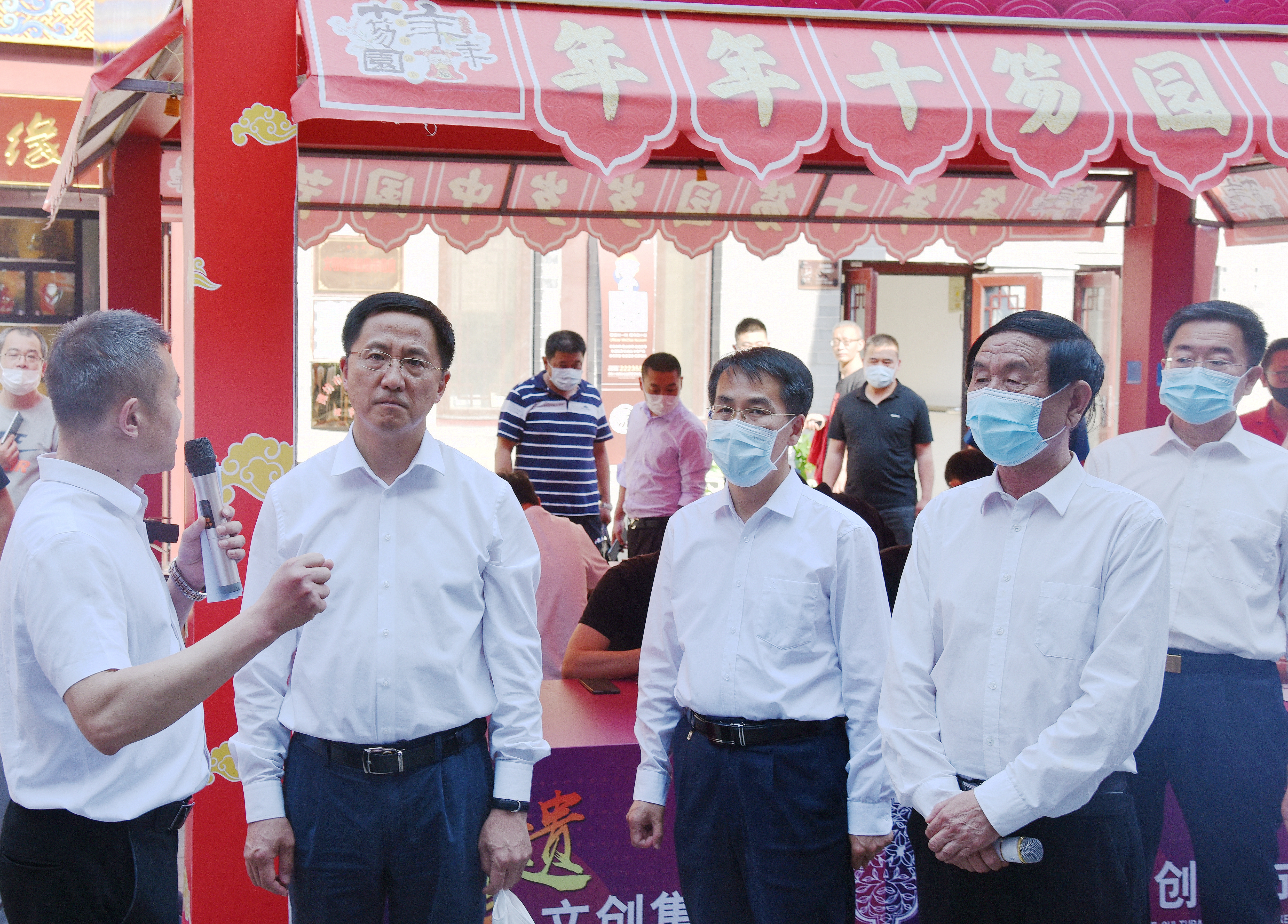 2020年5月22日下午,濰坊市委書記、市人大常委會主任惠新安一行到十笏園文化街區就夜間經濟產業形態、消費環境、設施配套等情況進行了實地調研并主持召開夜間經濟發展工作專題座談會。市領導李蘭祥、范福生出席會議。集團公司黨委副書記、總經理張良富陪同調研。