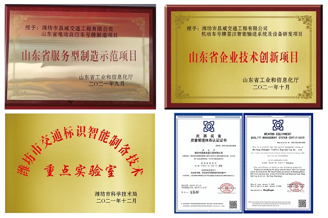 集團公司所屬濰坊市昌威交通工程有限公司喜報不斷,接連在車輛號牌專業領域取得一批創新科技成果。2021年9月14日,昌威交通電動自行車號牌制造項目被山東省工業和信息化廳評選為“2021年山東省服務型制造示范項目”,成為濰坊市首家獲此殊榮的企業;2021年10月18日,公司自主研發的機動車號牌簽注智能輸送系統及設備研發項目,列入2021年山東省企業技術創新項目計劃(第二批);2021年12月24日,公司交通標識智能制備技術重點實驗室經濰坊市科學技術局批準立項;2022年1月11日,昌威交通順利通過國軍標質量管理體系(GJB9001C-2017)認證審核工作,被授予武器裝備質量管理體系認證證書。