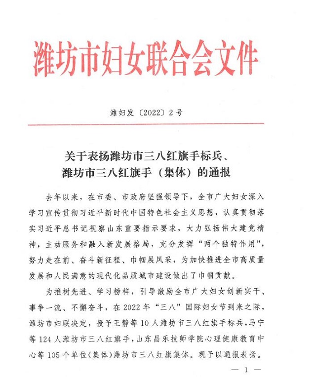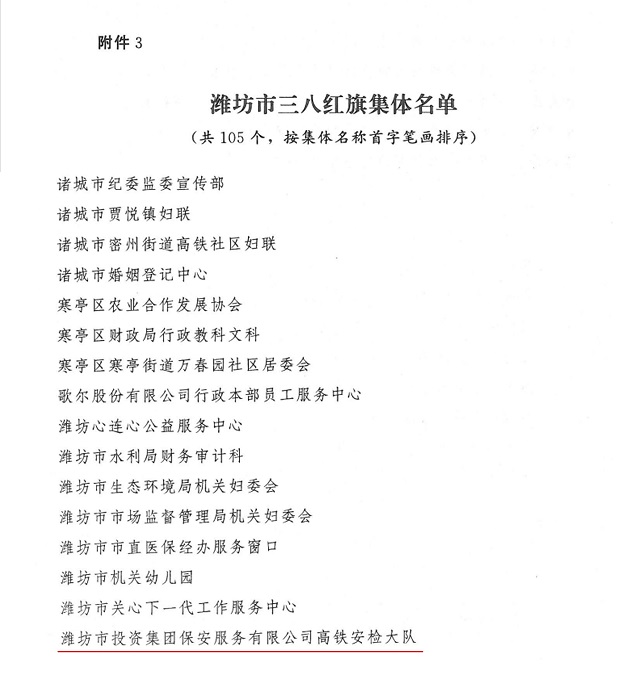 在“三八”國際婦女節到來之際,市投資集團再次獲得榮譽稱號:集團公司所屬昌威保安集團高鐵安檢大隊被濰坊市婦聯評為“濰坊市三八紅旗集體”。